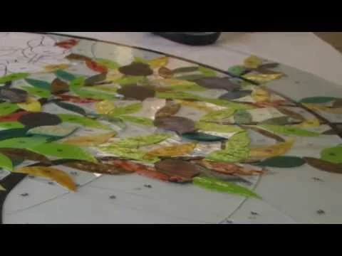 After the entire panel has been cut out and laid on the duplicate pattern, it is ready for assembly. David assembles the windows using the traditional method of assembly by lead caming, almost exclusively. We assemble the window on the original cutting pattern for accuracy. A piece of glass is laid on its space and then a segment of lead channel or caming is wrapped to the edge of the glass and held in place by glazing nails. Next, the adjacent piece of glass is placed into the channel, held with nails and then wrapped with lead. Pieces of glass are adjusted with grinder and grozing pliers, continually making sure that the window does not expand.This process is repeated for each piece of the panel until all the glass pieces are held in the lead matrix. A specialized border channel is added to the edges of the window to allow for some small adjustment to the overall size during installation, if necessary.